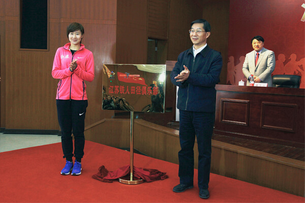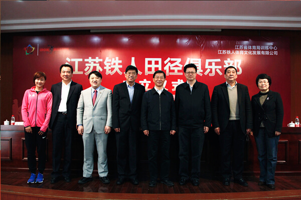 4月17日,江蘇鐵人田徑俱樂部成立儀式在江蘇省體育局訓練中心隆重舉行.江蘇省副省長曹衛星、省體育局局長陳剛、副局長楊國慶、省體育局訓練中心主任陳柏、黨委書記盛蕾等領導及公司黃承斌董事長出席了簽約儀式。江蘇省田徑隊全體運動員、教練員及管理人員,鐵人公司、各市田徑協會及有關單位嘉賓百余人參加了成立儀式。成立儀式由楊國慶副局長主持。儀式上,訓練中心黨委書記盛蕾與黃承斌董事長簽訂了合作協議書,曹衛星副省長為“江蘇鐵人田徑俱樂部”揭牌。
